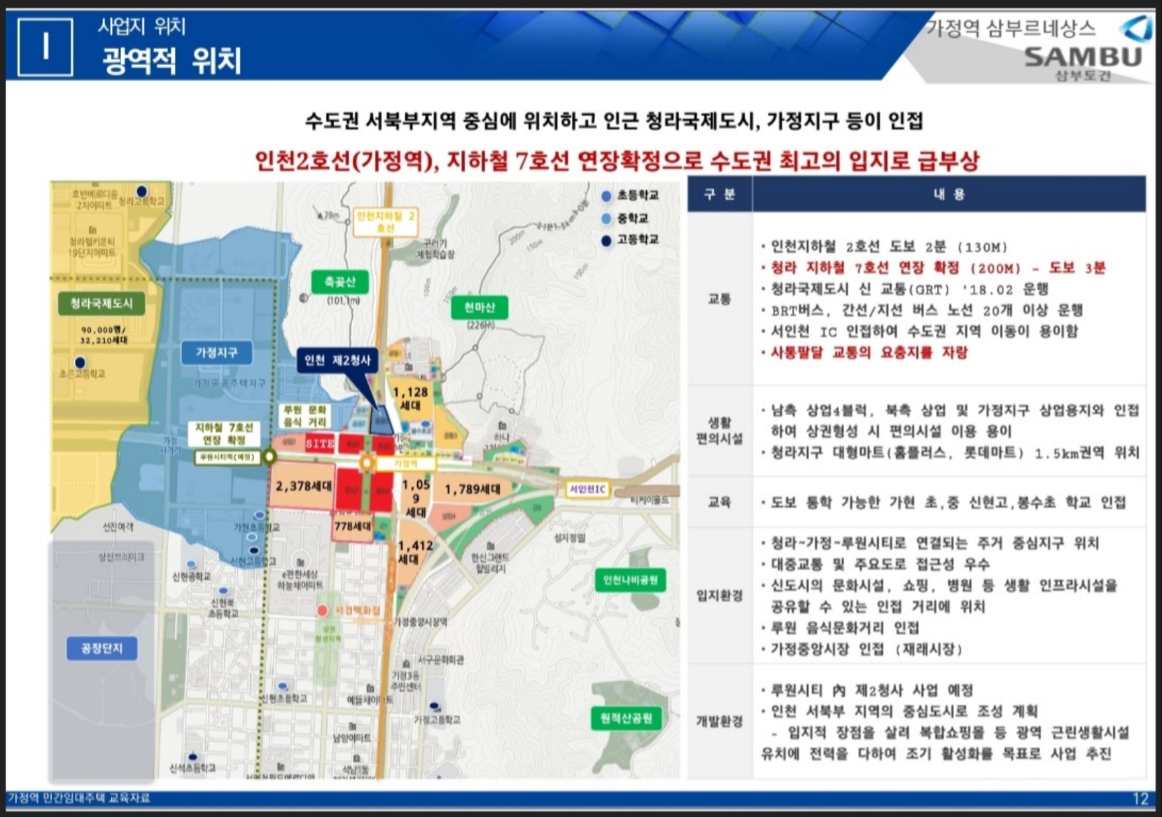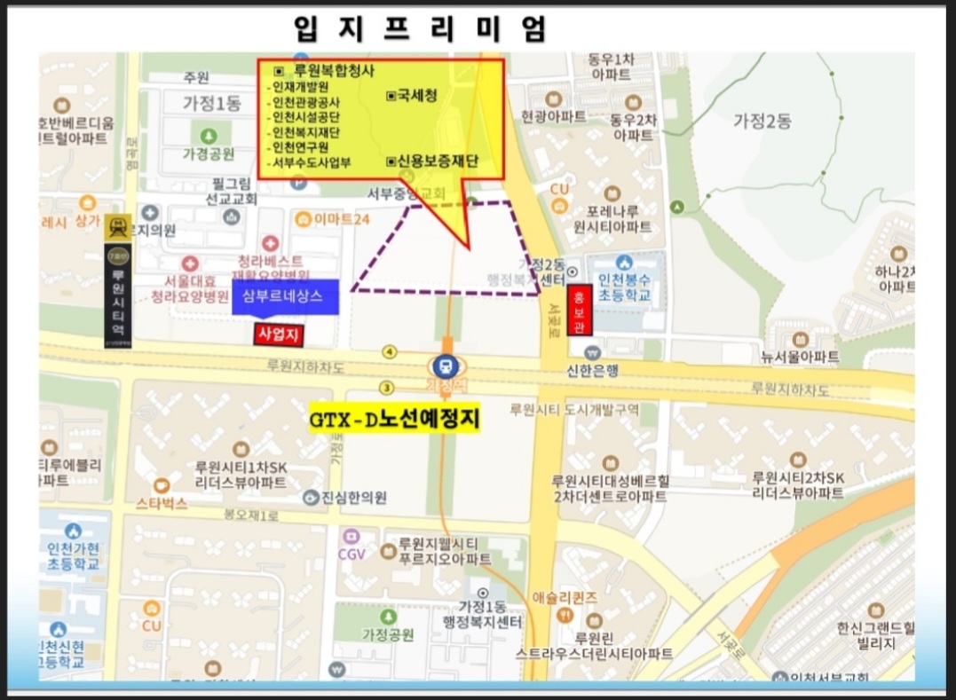 루원시티 SK 1차 맞은편 부지이며 인천 지하철 가정역과는 도보 2분 거리입니다. 7호선이 현재 공사 중으로 도보 3분 거리에 위치하고, GTX-D 노선이 바로 코앞에 착공 중에 있는 정말 노른자위 중의 중심 입지를 자랑하고 있습니다.